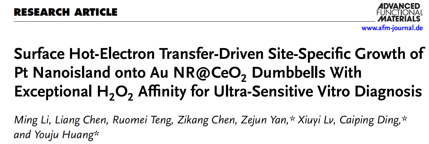 近日,杭州师范大学材料与化学化工学院黄又举教授团队敏锐捕捉到热电子激发与转移调控在纳米酶探针材料精准结构设计与性能优化中的关键作用,创新性提出“多维度协同调控”策略,为解决传统纳米酶的亲和力难题提供了全新思路。相关研究工作以“Surface Hot-Electron Transfer Driven Site-Specific Growth of Pt Nanoisland onto Au NR@CeO₂ Dumbbells with Exceptional H₂O₂ Affinity for Ultra-Sensitive Vitro Diagnosis”为题在Advanced Functional Materials上发表。