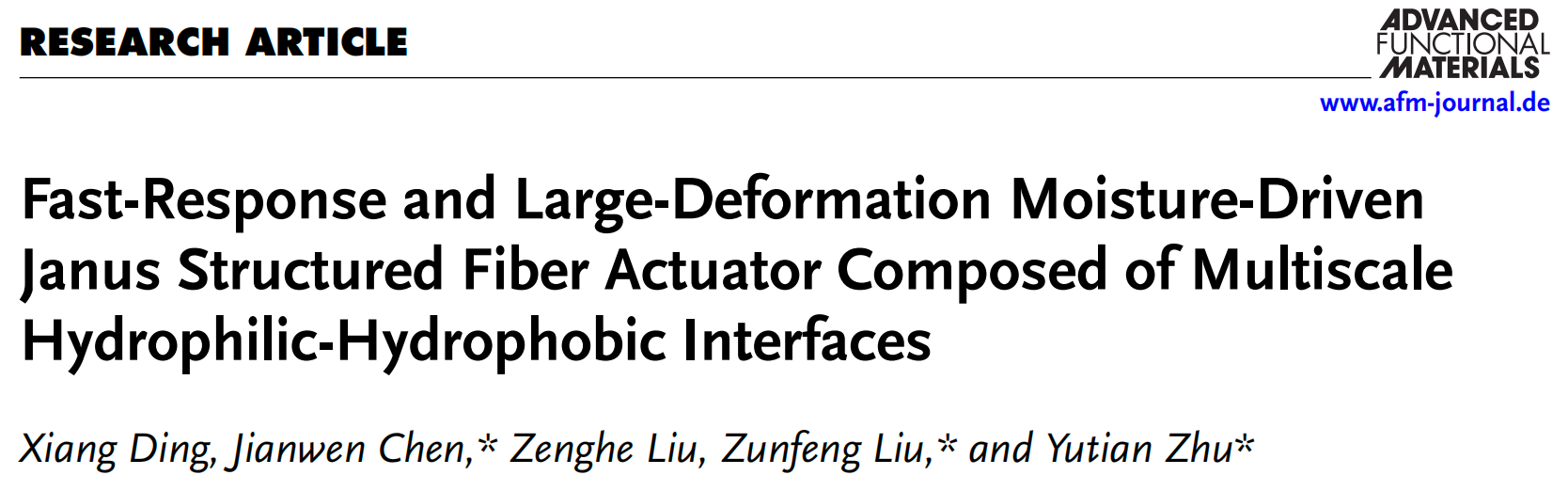 近日,材料与化学化工学院朱雨田教授团队联合南开大学刘遵峰教授,在超快响应与超大形变湿气响应纤维驱动器研究方面取得新进展。相关成果以 “Fast-Response and Large-Deformation Moisture-Driven Janus Structured Fiber Actuator Composed of Multiscale Hydrophilic–Hydrophobic Interfaces” 为题,发表在国际知名期刊 Advanced Functional Materials(2025,影响因子19)上。