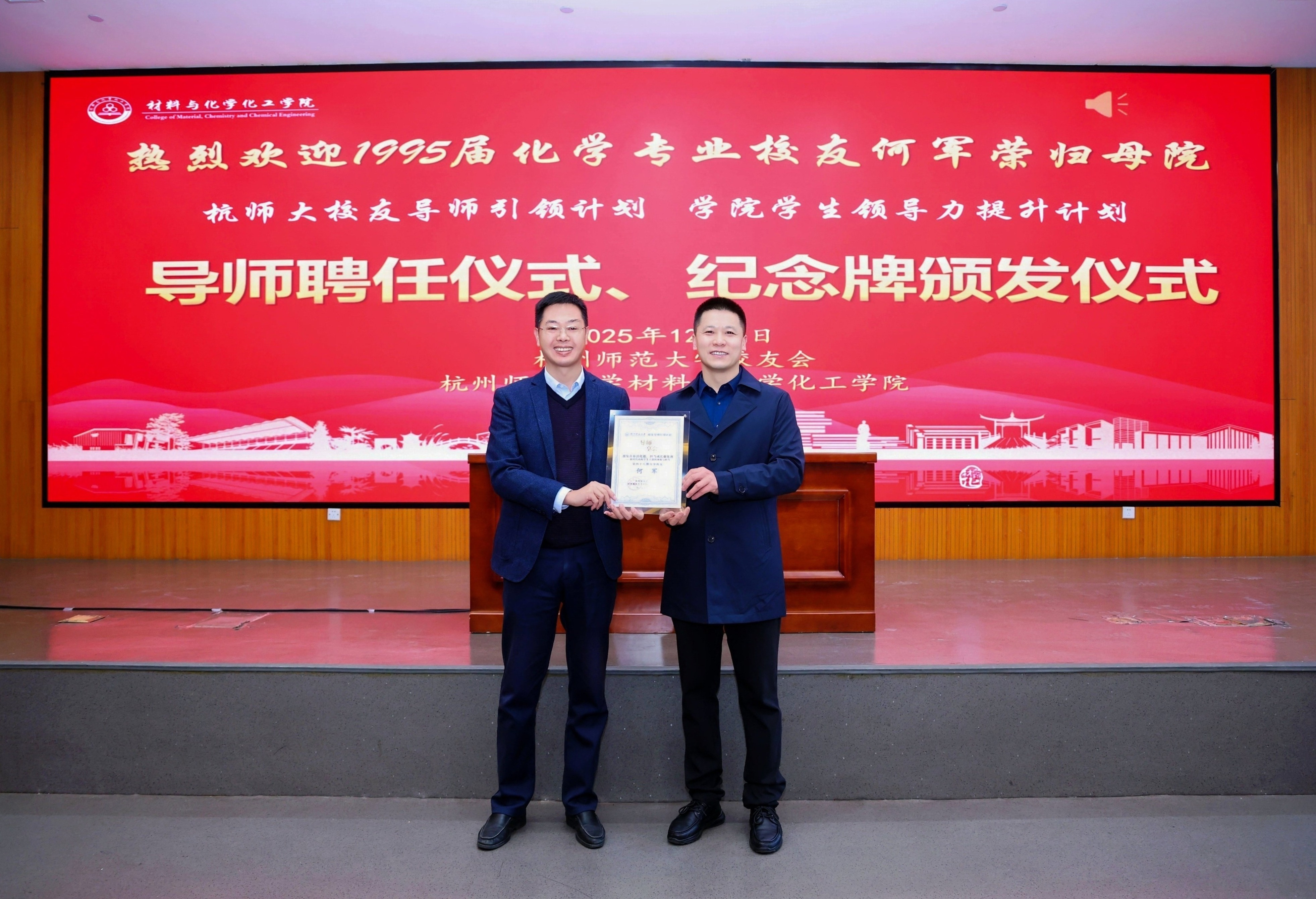 论坛开场前,学院举行了导师思享会纪念牌颁发仪式,聘任何军校友为杭师大校友导师引领计划、学院学生领导力提升计划导师,管庆江代表学院为何军颁发“导师思享会”纪念牌。