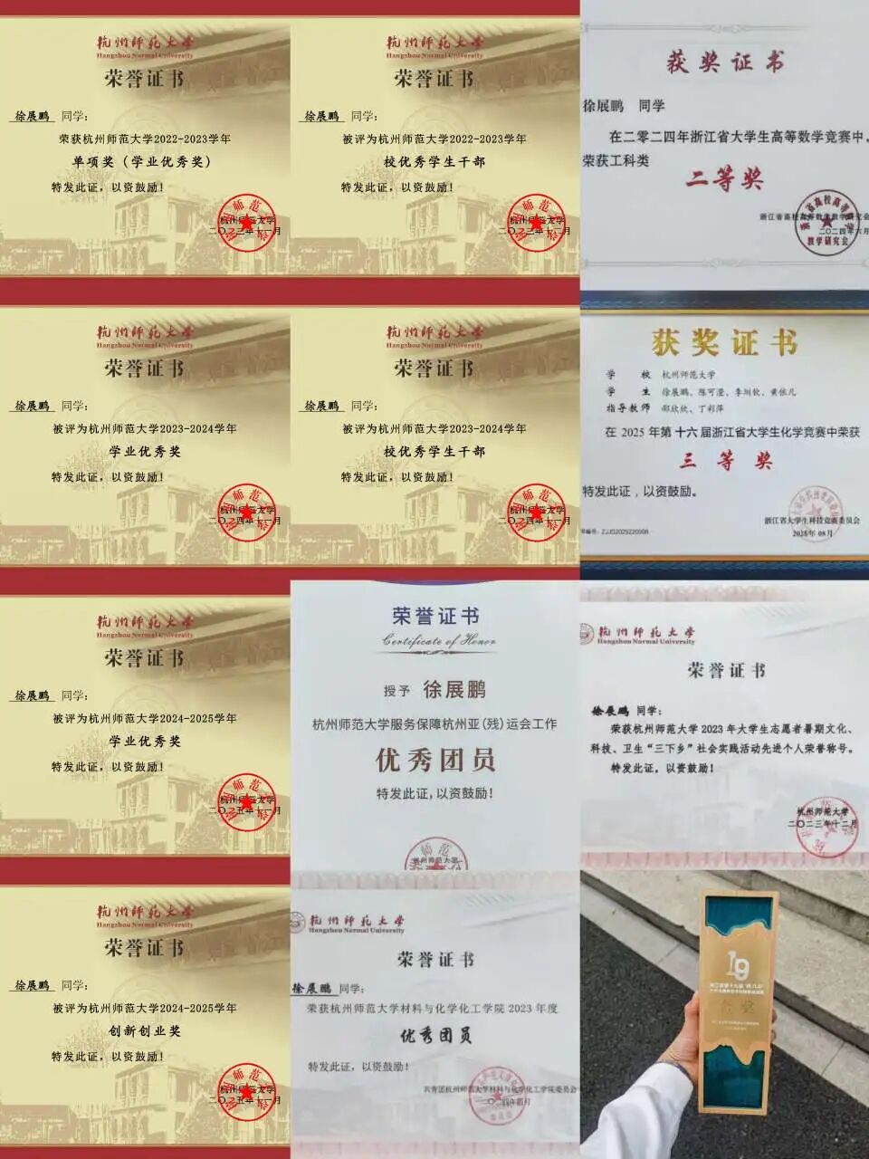 推免准备期间,徐展鹏也积极参与学科竞赛。在他看来,竞赛不仅是能力的证明,更是对所学知识的整合与运用。2025年6月底至7月中旬,徐展鹏与队友陈可澄、黄依凡、李圳钦共同投身于浙江省大学生化学竞赛。那段时间,他们真正诠释了什么是团队协作——每个人都想着自己多做一些,课题就能推进得更快,其他队友就能轻松一点。“特别令我感动的是,7月中旬我需前往厦门参加夏令营,队友和指导老师邵欣欣、丁彩萍都坚定地支持我——你安心去参营,竞赛这边有我们。”在老师们的全力支持下,小队完成了80个有机合成实验及相应的后处理、表征测试与数据分析,并高质量撰写了研究报告与综述。“最终,我们团队荣获三等奖,而这段同心协力、彼此托举的经历,比奖项本身更让我珍惜。”在“挑战杯”竞赛中,我也与团队成员共同打磨项目,最终获得省级金奖。这些经历不仅丰富了个人履历,也让徐展鹏更加明确:推免并非只看成绩,扎实的学科基础、系统的科研训练和全面的综合素质,缺一不可。