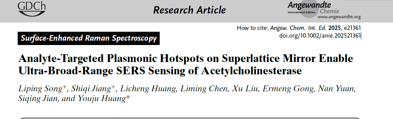 近日,我院黄又举教授在超分子主客体助力胶体粒子超晶格膜实现酶触发式SERS传感机制取得新进展。相关研究成果以“Analyte-Targeted Plasmonic Hotspots on Superlattice Mirror Enable Ultra-Broad-Range SERS Sensing of Acetylcholinesterase”为题,发表于Angewandte Chemie International Edition (Q1, IF=16.7), DOI: 10.1002/anie.202521361。