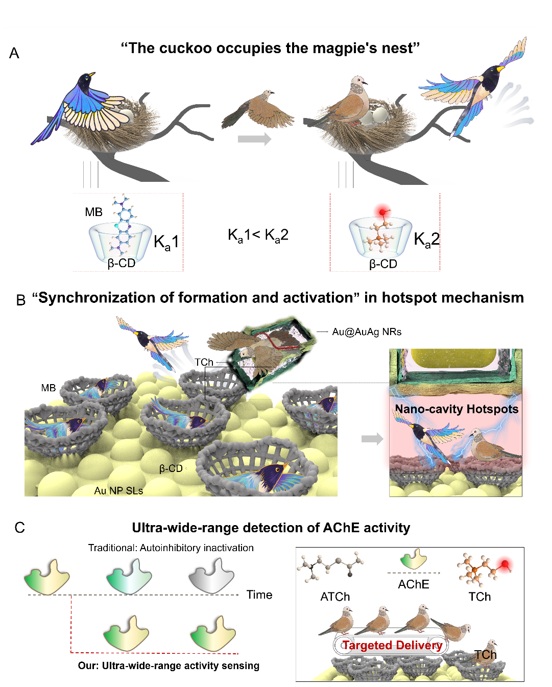 整个检测过程的巧妙之处,在于将酶的催化反应转化为界面分子竞争事件,并同步完成传感结构的锁定,设计包括以下三个方面:(1)酶促反应与靶向输送:当样品中存在目标酶——AChE时,它会催化底物水解生成产物巯基胆碱(TCh)。TCh分子被溶液中的金-银纳米棒捕获并输送到修饰有β-CD的超晶格界面;(2)竞争置换实现“占巢”:到达界面的TCh,凭借其与β-CD空腔更强的结合亲和力,将预先占据其中的报告分子MB竞争性地置换出来,迫使MB离开空腔扩散至周围环境。这一过程如同“鸠占鹊巢”,直接导致了界面处MB信号分子拉曼信号强度的变化;(3)共价锚定完成“锁巢”:成功“占巢”的TCh分子,通过其末端的巯基与超晶格的金表面形成牢固的金-硫共价键。这一作用将整个传感界面“锁定”在一个稳定的状态,并增强了纳米棒与基底之间的等离激元耦合。