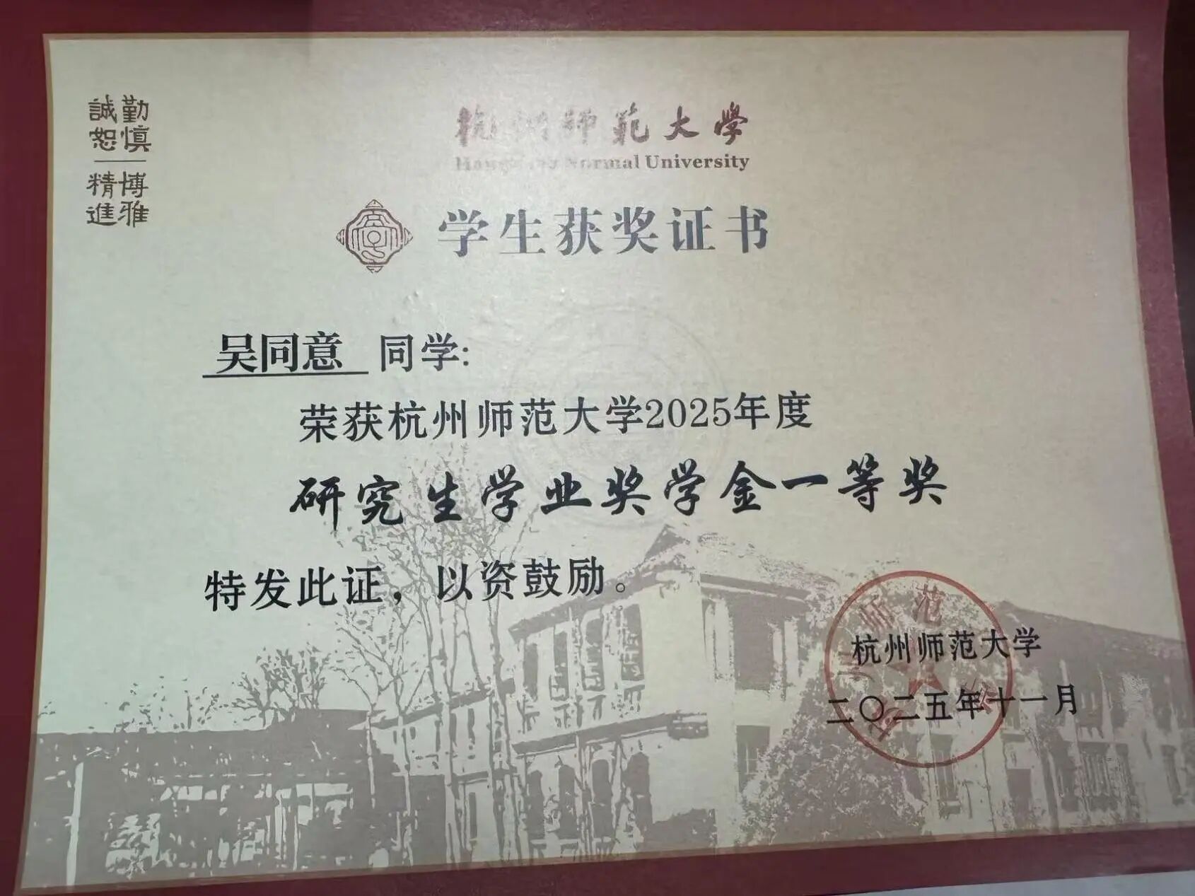 连续三年校一等奖学金