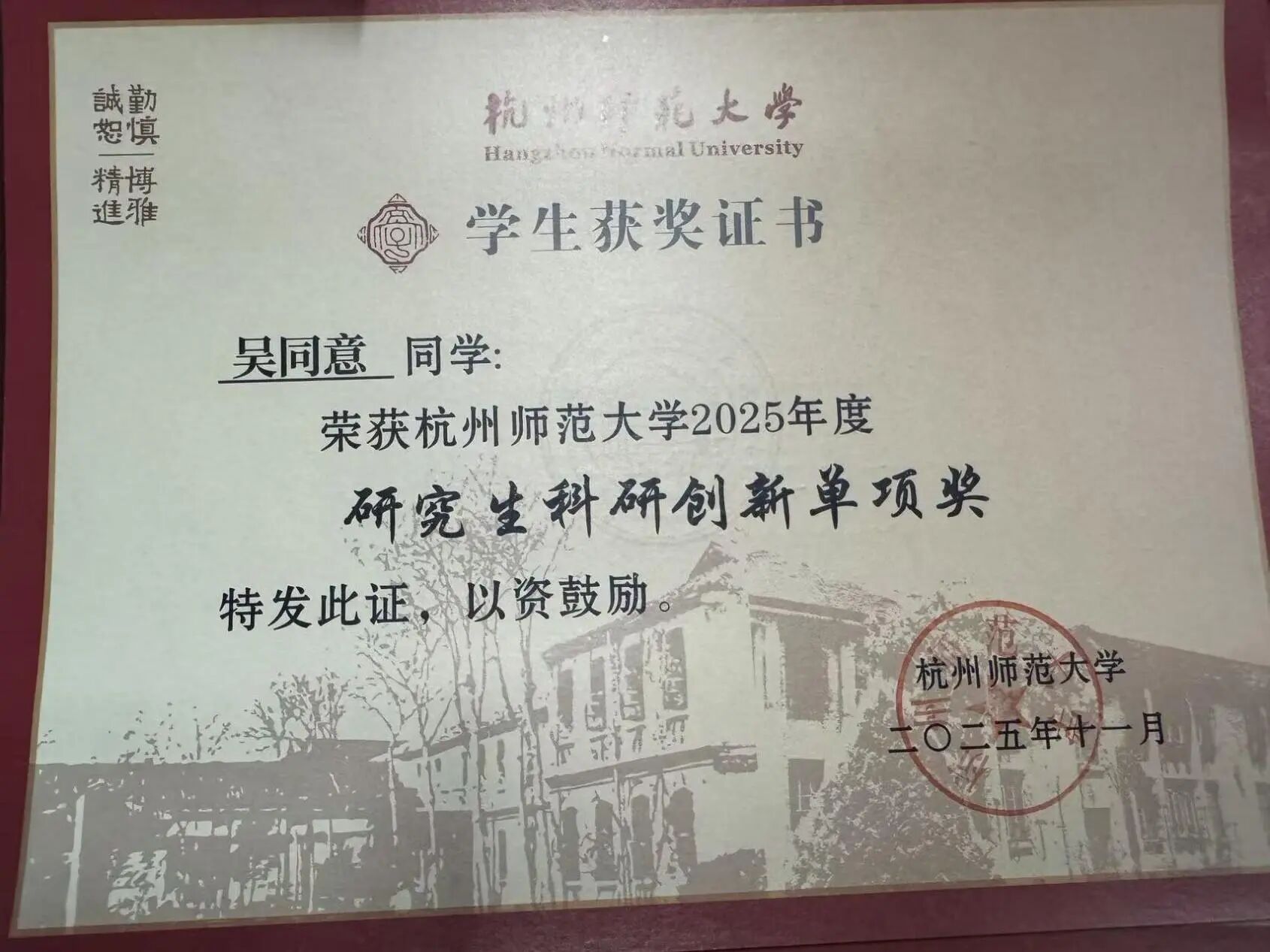 凭借出色的科研积淀,吴同意的下一站,是中国科学院化学研究所的博士深造之旅。在旁人看来,这是前途似锦、风光无限的坦途。然而,吴同意却有着超越年龄的清醒。“当人人都在称赞、羡慕我的时候,也正是我应该反思、慎行的时候。”他深信,人生是一场经历,本无好坏之分。外界的标签与掌声如同旅途的风景,看过便罢,前路仍需自己丈量。“我尽力而来,愿尽兴而归。” 这十个字,是他对过往的总结,也是对未来的期许。从西湖之滨的实验室,到国际学术论坛的讲台,再到国家战略科技力量的殿堂,他的每一步,都印刻着新时代青年“富于思辨精神”的特质:不盲从、不浮躁,在热爱中坚守,在担当中成长。