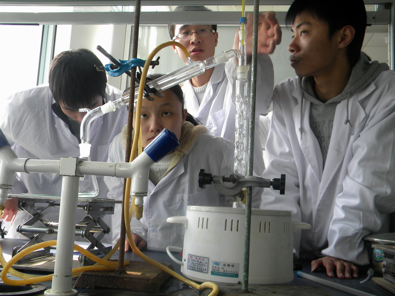 本次活动的主题是实验室废液的再回收利用。实验开始前,同学们就用何种方法来处理各种废液展开了激烈的讨论,在研究生学长的指导下确定了实验方案。而后,研究生学长给同学们一一介绍了器材,讲评了实验操作。在学长一番耐心的讲解后,心情忐忑的同学们也渐渐平静下来,开始踊跃地组装实验器材。   此时,学长们一边在旁边指点,纠正错误,一边对各小组进行点评,提出了一些注意事项。为了使各个组员能更加深切体会到团队协作精神,组长对各组员分配了不同的任务,让组员互相合作,并对实验现象进行分析及记录。最后,废液中的不同成分被一一分离和收集,充满成就感的微笑在组员们的脸上浮现。