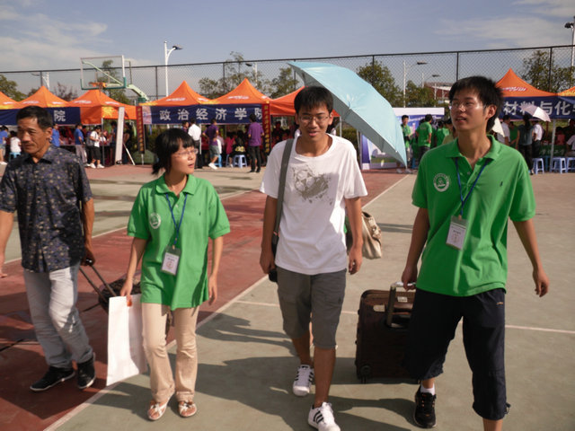 在灯光球场新生报到区,新生人手一个的资料袋可谓是个“百宝箱”,学院为新生准备齐全了新生入学需要的各种资料:学生手册、大学生安全知识读本、选课指南、本科培养方案、家校联系卡、手机卡……,方便新生高效完成报到程序。与往年一样,学院还特别为家庭经济困难的新生开通了“绿色通道”,并有迎新工作人员介绍学校奖、助、贷、减、免等一系列完善的救助体系,确保他们顺利入学。负责迎新生的同学为新生和家长提供着热情周到的服务,引导他们完成报到手续,报到完毕后又主动帮助新生搬运行李,带领他们入住到宿舍。在校园里,从报到点、家长休息处、生活区入口到寝室楼,材化的新生在哪里,材化绿色志愿们忙碌的身影就出现在哪里。