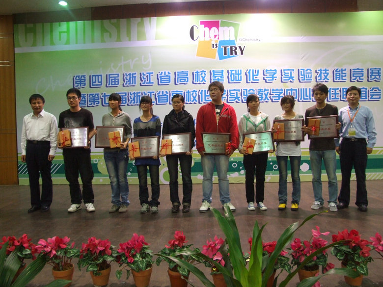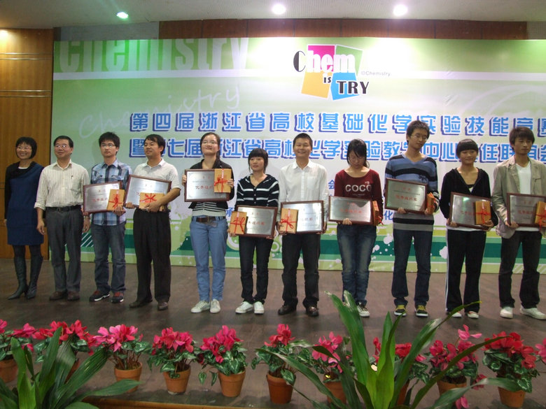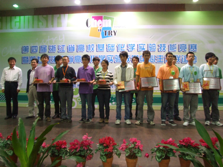 开幕式结束后,选手们调整状态,投入到紧张的比赛中。经过理论笔试和无机、物化、分析、有机综合实验操作的比拼,最终,在基础环节,徐代超等三位同学荣获一等奖,在实验操作环节,陈珊敏等三位同学荣获无机组一等奖,苏新立等两位同学荣获有机组一等奖,蒋苏杭等两位同学荣获分析组一等奖,柯丕余等两位同学荣获物化组一等奖。我校学生在个人奖项的角逐中也有出色发挥,钱晓燕、王锜励等同学在理论比赛中荣获一等奖、二等奖;付晨晨同学在操作比赛中获得有机组一等奖,王锜励、孙彬、钱晓燕等同学分获无机组、物化组、分析组三等奖。