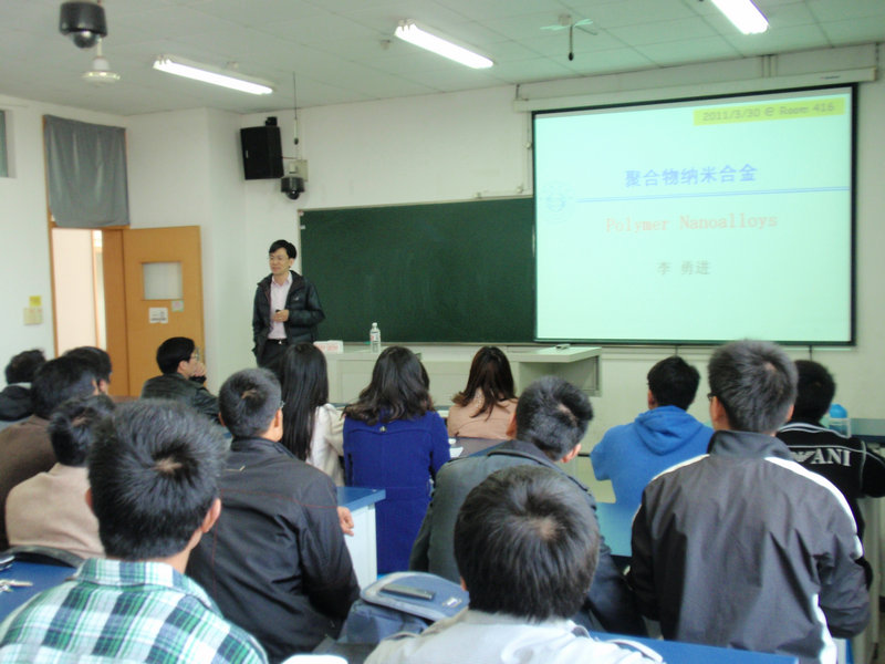 3月30日下午,材化学院“教师与研究生学术沙龙”启动仪式暨第一次活动在4号实验楼416教室举行。本次活动由学院新引进的日本国立产业技术综合研究所终身研究员、钱江特聘教授、浙江省千人计划人选李勇进教授为师生作了题为“聚合物纳米合金”的第一场报告,学院领导、相关专业教师、研究生和本科生参加了学术沙龙的此次活动。