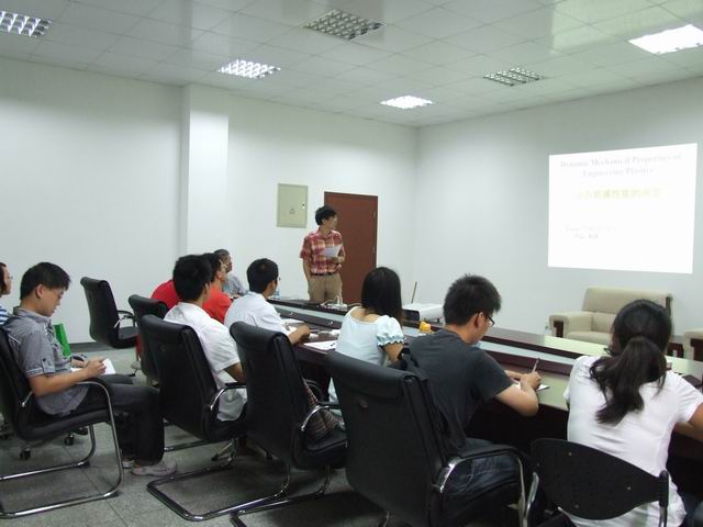 研究生课上,中山和郎教授主讲了“动态机械分析(DMA)在高分子材料性能测试方面的重要性”。他首先介绍了温度、湿度等对高分子材料机械性能的影响,接着提到了许多种性能测试的方法,并通过对照比较突出DMA的优越性。他从多方面、多角度给学生展示了很多常见的实例。老教授为了让同学们能跟得上他的节奏,获取更多的知识,他特意放慢了速度,而且在讲授的过程中声情并茂,在讲到较难理解的部分,他会拿起身边的书本等物品给学生模拟展示。同学们也能在听课的同时,发现疑问,提出问题,并及时和老教授探讨、交流。