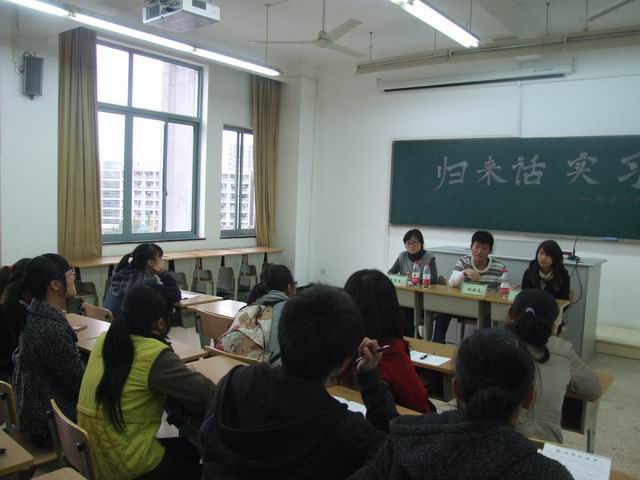 交流会上,三位同学各自就其实习生活、工作经验和求职经历三方面与在座同学进行了交流。姚晓龙同学谈及自己在长河高级中学为期两个月的实习生活,感触颇深。“自我介绍很重要,一个好的开始是成功的一半”。他以自身经历为例,强调了实习第一步——自我介绍的重要性,并告诫在座同学,实习期间一定要与教育指导老师建立良好的关系。同样是教育实习的袁文丽同学则从非师范生的角度阐述了她的教育实习经历。在她看来,非师范生也可以从事教师这一职业,并为同学们详细解答了如何考取教师资格证、如何处理师生关系以及教师如何把握课堂时间等问题。而在杭州市桐庐光学医疗仪器总厂进行实习的廖赛芬则为同学们带来她的四点感悟:提高自身学习能力,做好吃苦的心理准备,具备勇于承担的精神,把握好人际关系。