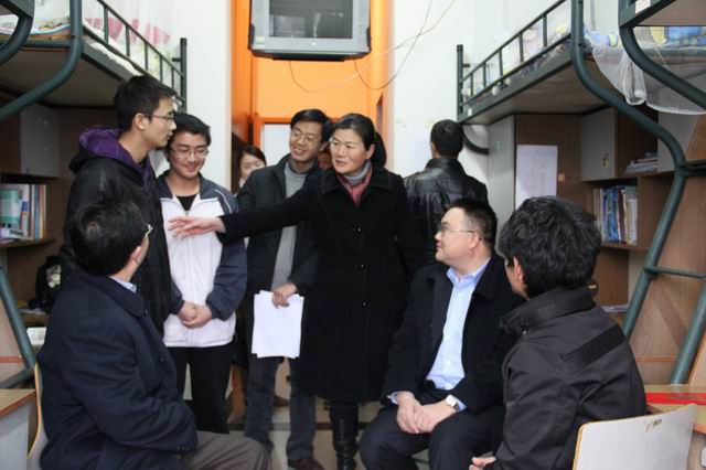朱斌、张志军一行人首先来到学生的宿舍,在何丽君的介绍下,领导们还仔细询问了学生的家庭、生活情况,以及他们是否适应了大学的新环境。针对春节回家的问题,领导们同样关切地询问学生们如何购票。在得知学生们已成功购票时,真诚祝福他们有一个安全的旅途。随后,领导们还向寝室的其他同学了解了寝室生活,提出同学们和谐相处的愿望,并致以了节日的问候。同时,同学们也表示会在新的一年中更加努力学习,用自己的奋斗实现追求已久的理想。严寒被领导们的热切关怀驱散,寝室沉浸在一片温馨的氛围之中。 这次走访活动虽然短暂,但却对同学们起了很大的鼓励作用。情暖新春,领导们送出最真挚的祝福。同学们怀揣着新年的美好愿望与祝福同材化学院共同迎接新的一年。(文/胡秋月 图/郑都)