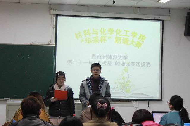 为体现材化学院青年学子的精神风貌,提高学生的文化涵养,传播朗诵艺术,并为校第二十一届“北极星”朗诵比赛做好选拔工作,3月18日晚,由学院学习部主办的“华采杯”朗诵比赛于四号实验楼416教室火热开幕。学院团委辅导员白芸老师、刘家兴老师,以及师大校园广播台“水煮咨询”栏目主播周萍同学出席并担任大赛的嘉宾评委。