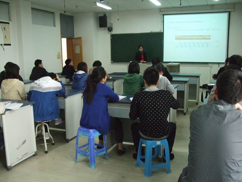 赵丽萍博士首先给我们介绍了碳纳米管的一些性能以及它的制备应用,接着又从碳纳米管对聚合物的改性方面详细讲解了这种复合材料的优势,最后重点强调了这种复合材料的制备以及材料的表征。讲座最后,在座师生纷纷提出自己感兴趣的问题或疑惑,赵博士都一一进行了耐心解答。
