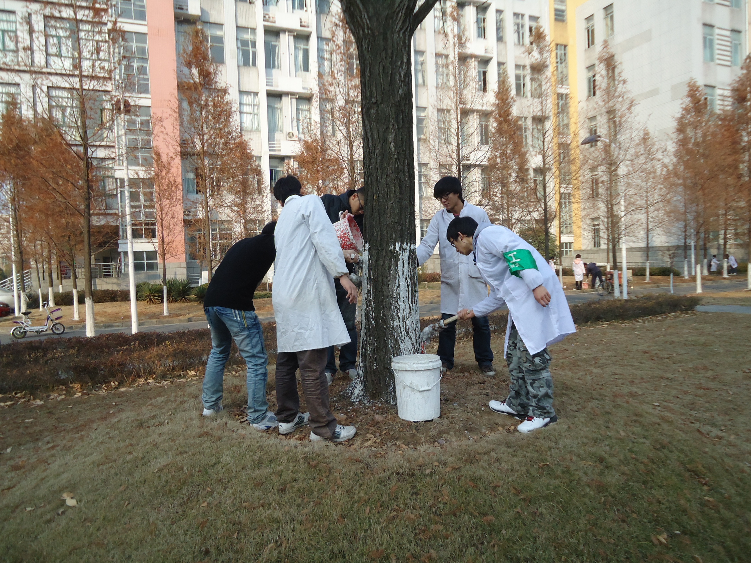 活动当天,我院义工统一身着实验服、佩戴绿色材义联盟袖章在学院东门集合。在后勤师傅的悉心指导下,义工们很快便掌握了刷漆的基本要领,并马不停蹄地展开了工作。活动以两人为一小组,在草地上划分好包干区域,有序地进行工作。只是“一蘸”、“一抹”的动作,看似简单,但要想在这些粗糙的树皮上将粘稠的石灰均匀涂抹却并不是一件轻松的事。后勤园艺工人也很热情地加入了我们的义工活动,身体力行的同时不忘指点义工们刷漆技巧。一个半小时的刷漆活动中义工们没喊一句辛苦,反而各个干劲十足,为100多棵树木穿上了整齐的洁白“新衣”。