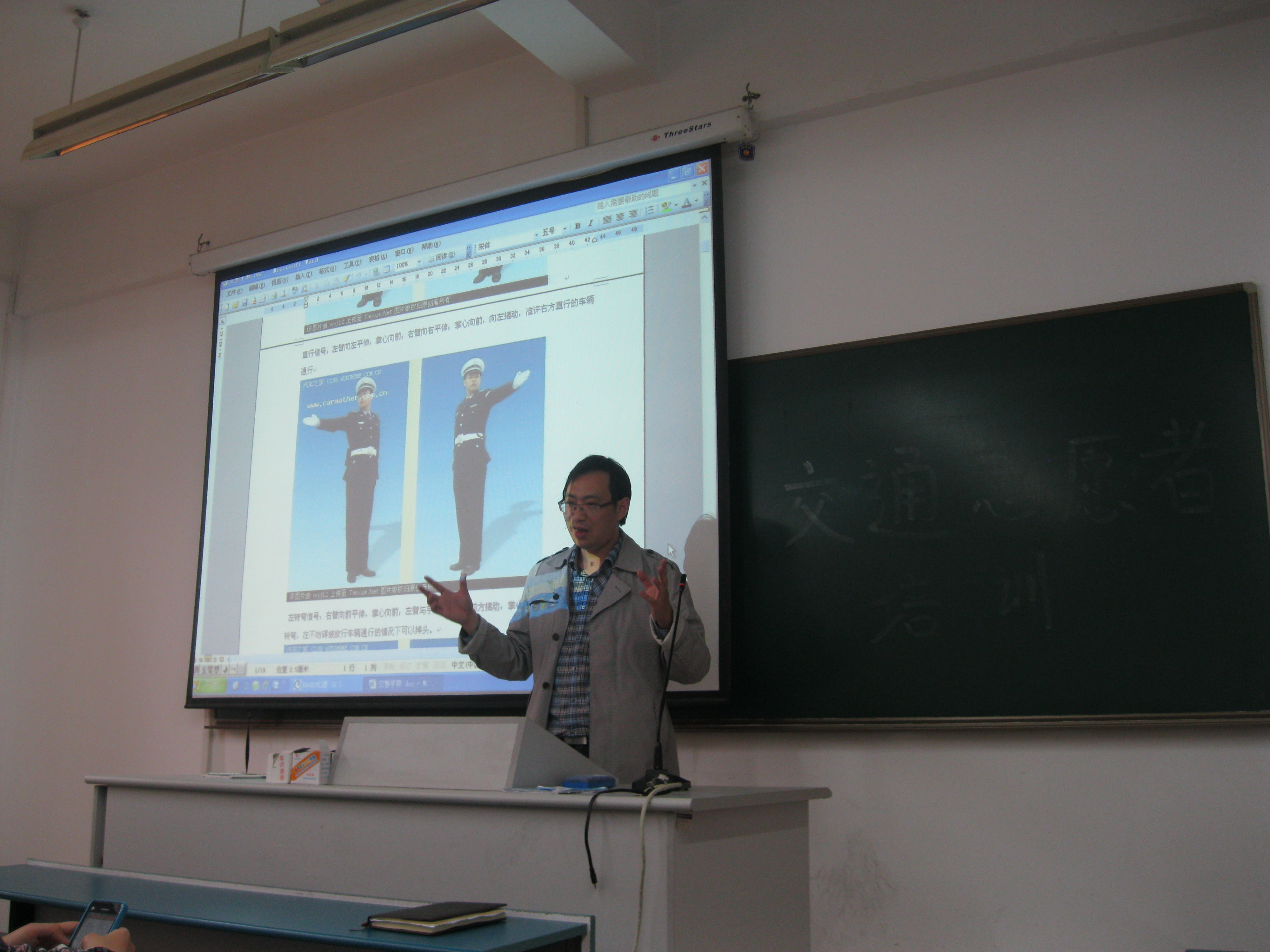 为了使交通志愿者们更标准更规范地维护交通秩序,5月8日下午,由材化学院青年志愿者协会与生科学院青年志愿者协会联合举办的交通志愿者培训活动在教学楼B楼212如期举行。校保卫处王老师出席了本次活动。