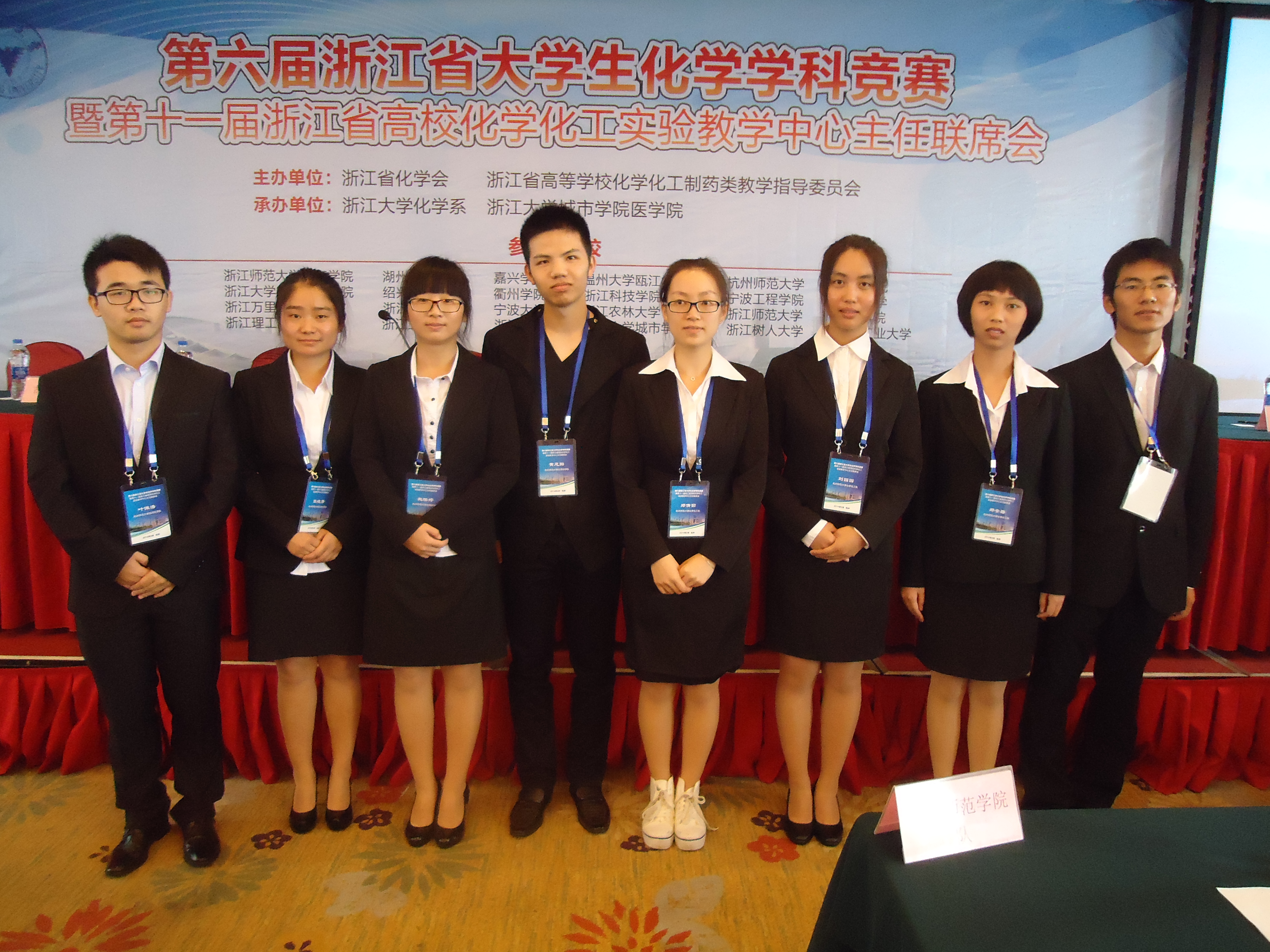 9月21日,由浙江省化学会、浙江省高等学校化学化工制药类教学指导委员会主办,浙江大学承办的2014年第六届浙江省大学生化学学科竞赛决赛落下帷幕,我校应用化学队,化学化工队(应用化学队:施怡婷、叶佩浩、张晓芳、黄恩浩;化学化工队:郑倩茹、郑安碧、宋跃、刘园园;指导教师:郑卫新、李世军、王民)敢于拼搏、勇于突破,两队双双获得一等奖。