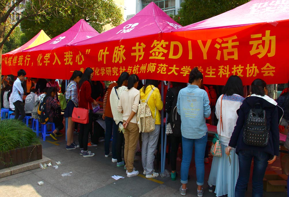 10月15号11:30至14:30,由杭州师范大学学生科技协会和材化学院贵之烯化学研究社联合举办的“科技伴我行,化学入我心”叶脉书签DIY活动在二期广场隆重举办。