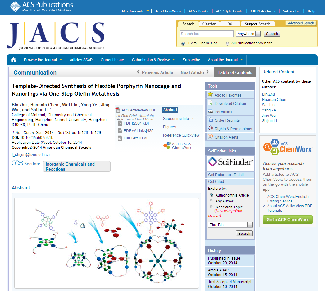 近日,我院研究生朱彬同学以第一作者身份在国际一流化学期刊《美国化学会志》(Journal of the American Chemical Society,2013年影响因子为11.444)发表了一篇题为 “Template-Directed Synthesis of Flexible Porphyrin Nanocage and Nanorings via One-Step Olefin Metathesis” 的学术论文(J. Am. Chem. Soc. 2014, 136, 15126−15129)。朱彬同学是材化学院第一位以第一作者身份在国际化学顶尖期刊上发表学术论文的研究生。