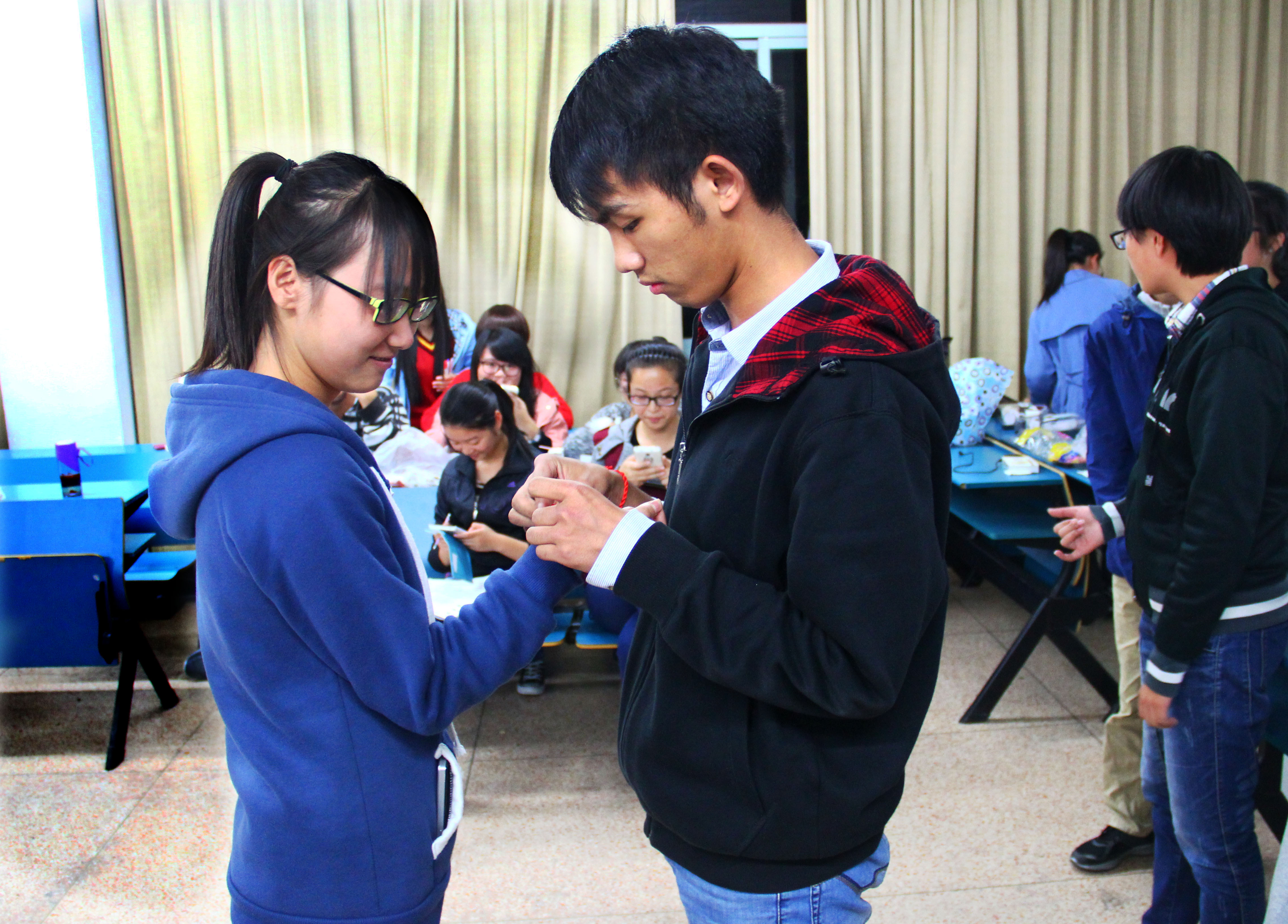 活动于18:00准时开始,此前,男女生已经抽取了座位编号,男生女生隔开坐。在主持人的引导下,第一轮的6对情侣参与了情景剧表演、趣味小知识问答两个环节,比拼十分激烈,并以一对情侣获得了奖品而告终。第二轮抽取了9对情侣,分为三组,进行了情定热气球、绑腿、你说我做三个游戏,记得分最高者,该环节有两对情侣并列第一。活动期间,同学们无不争先恐后,积极地参与到游戏之中,现场气氛异常热烈。