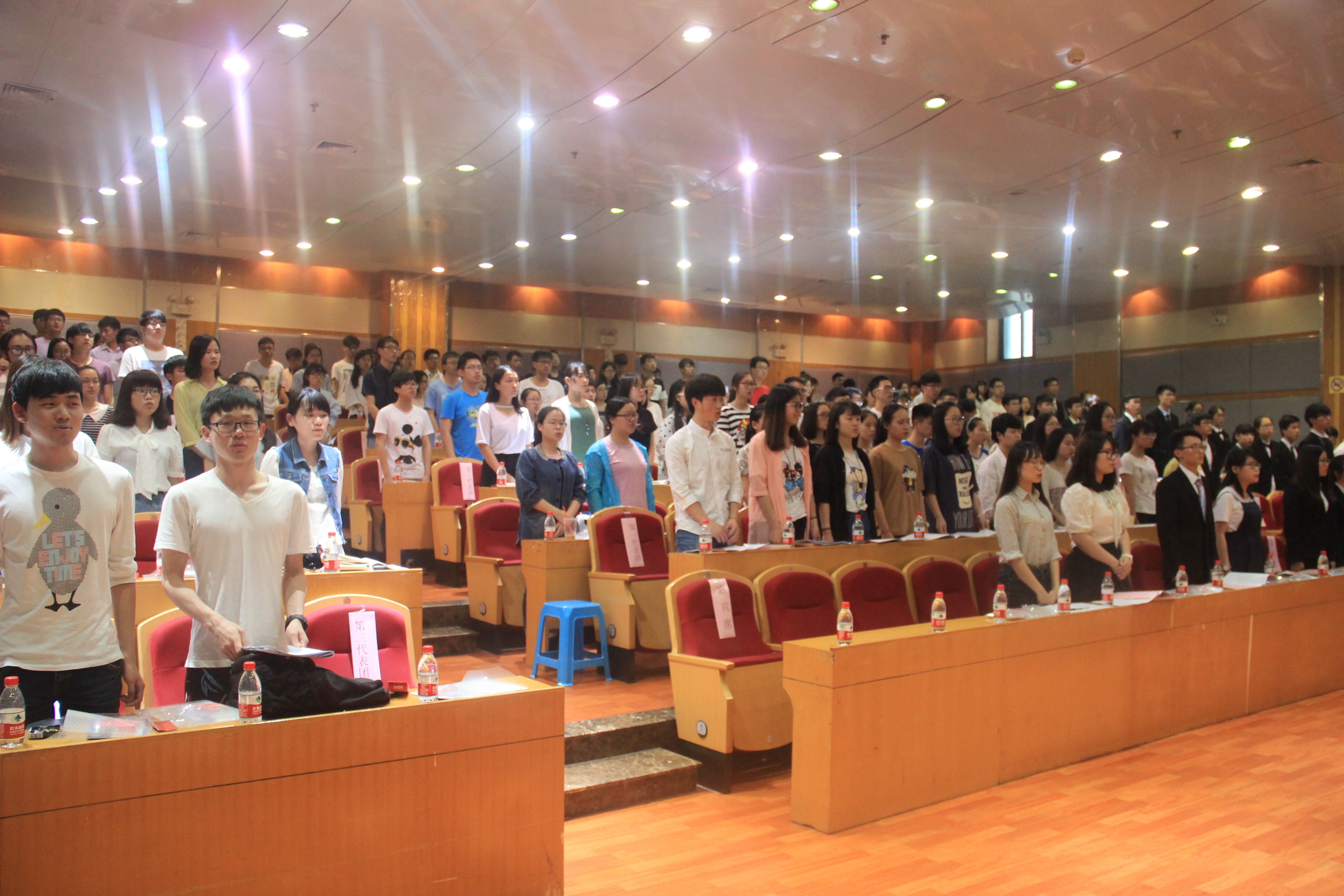 14:30,会议正式开始。全体起立奏唱国歌之后,江书记为本次大会致开幕词,总结了这一年来我院在工作上取得的极大进展,希望学生能积极创新,勇于实践,更全面地发展。随后,校学生会常务副主席池倩倩同学、生命与环境科学学院学生会代表李楠同学先后上台致词,肯定了我院在过去的一年里开展的学生工作,并表达了对我院未来的学生工作的祝福。此外,我院第十届学生会主席陈佳苗同学向各位代表作第十届学生委员会工作报告,也寄托了对第十一届学生委员会的殷切期望。