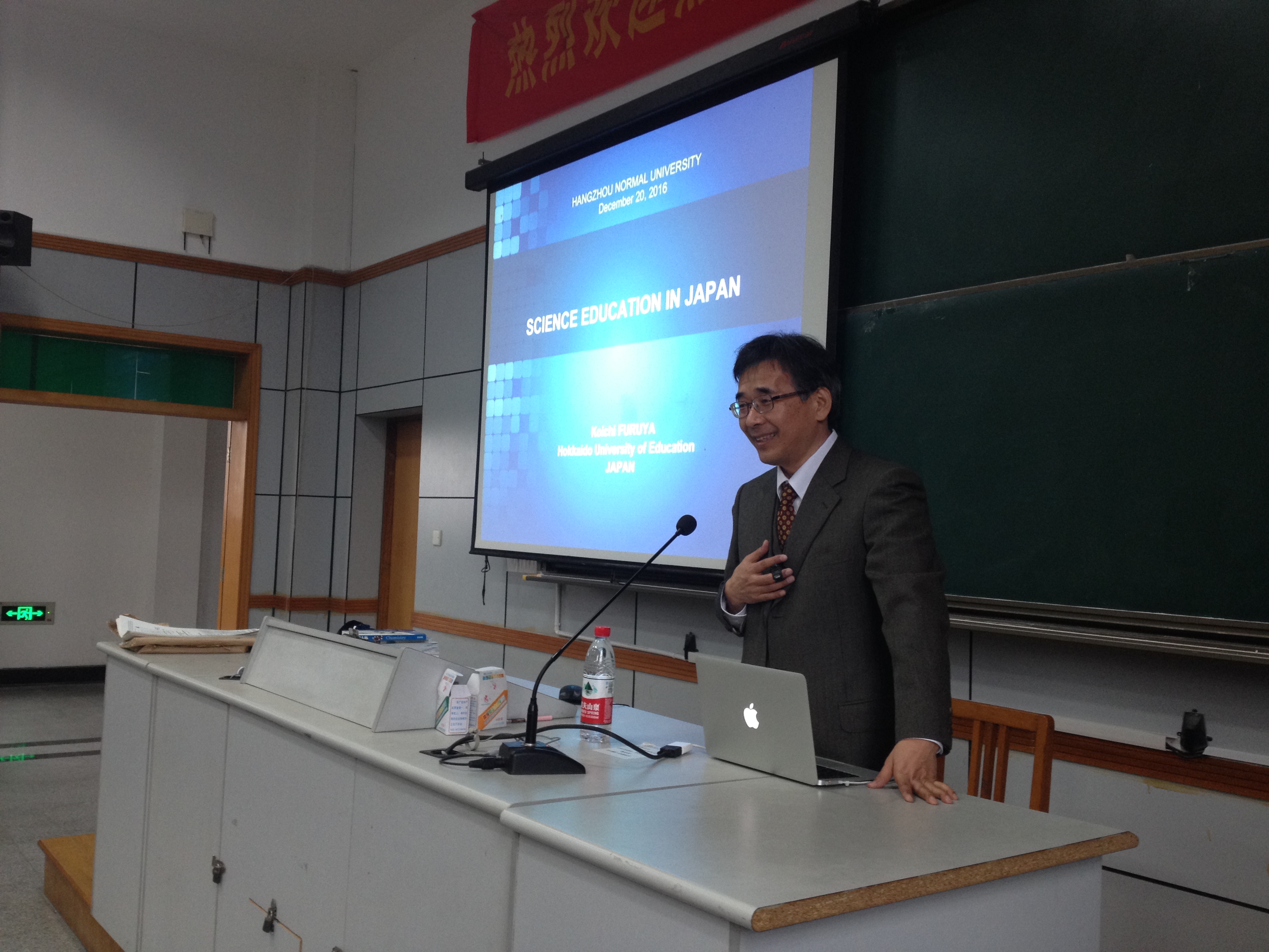 12月20日上午9:00,日本北海道教育大学科学教育专业古屋光一教授应邀在我校下沙校区C—202教室进行了主题为“Science Education in Japan”的讲座。材料与化学化工学院化学师范专业14级本科生与韦斯林副教授、理学院物理教育和科学教育专业14级本科生与陈斌副教授以及学科教学(化学、物理、科学)专业10余名硕士研究生参加了本次讲座,由韦斯林副教授主持。