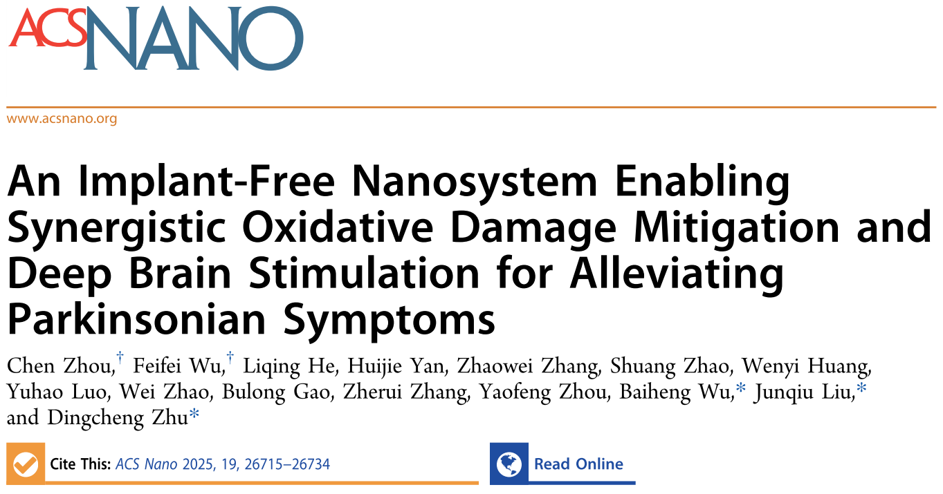 近日,杭师大材化学院刘俊秋教授团队在神经Ca2+信号激活的交叉研究领域取得突破性进展,相关研究成果以题为“An Implant-Free Nanosystem Enabling Synergistic Oxidative Damage Mitigation and Deep Brain Stimulation for Alleviating Parkinsonian Symptoms”发表于ACS Nano(IF = 15.4)。