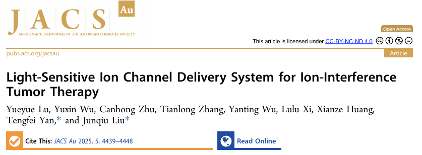 近日,我院刘俊秋教授团队在光控人工离子通道用于肿瘤治疗领域取得重要突破。相关研究成果以题为 “Light-Sensitive Ion Channel Delivery System for Ion-Interference Tumor Therapy” 发表于国际化学领域顶级期刊 JACS Au上。