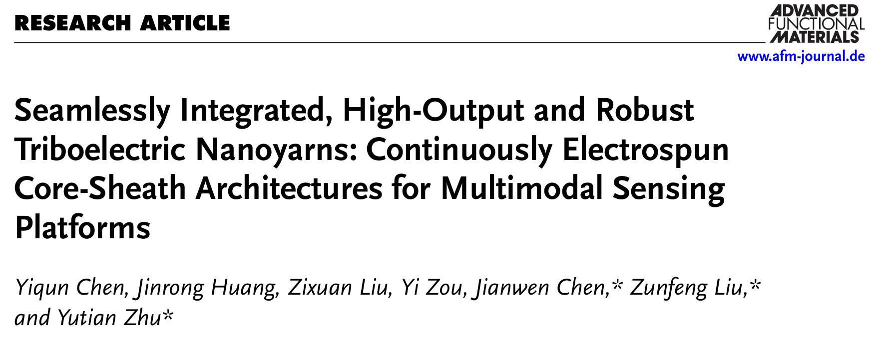 近日,材料与化学化工学院朱雨田教授团队联合南开大学刘遵峰教授,在智能纤维传感与人机交互领域取得新进展。相关成果以 “Seamlessly Integrated, High-Output and Robust Triboelectric Nanoyarns: Continuously Electrospun Core-Sheath Architectures for Multimodal Sensing Platforms” 为题,发表在国际知名期刊 Advanced Functional Materials(2025,影响因子19)上。