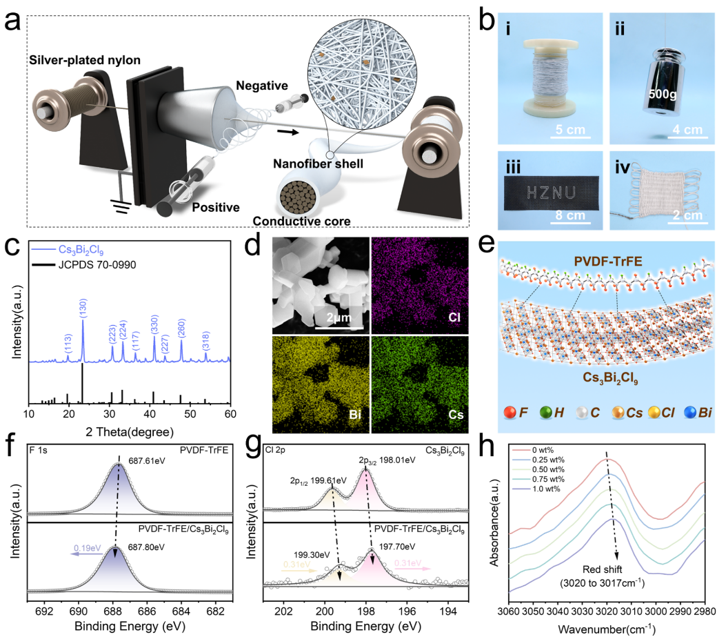 图1. 同轴纳米纱线(CNYs)的制备与表征;a) 连续共轭静电纺纱制备CNYs的示意图;b) PVDF-TrFE/Cs3Bi2Cl9 CNYs的光学照片:i) 成卷的CNYs,ii) 承受500g重量,iii) 十字绣"HZNU"图案,iv) 编织成斜纹织物;c) Cs3Bi2Cl9微晶的XRD图谱;d) Cs3Bi2Cl9的SEM图像及相应元素分布图;e) Cs3Bi2Cl9与PVDF-TrFE相互作用示意图;f) 纯PVDF-TrFE和PVDF-TrFE/Cs3Bi2Cl9复合材料的F 1s谱图;g) Cs3Bi2Cl9及PVDF-TrFE/Cs3Bi2Cl9复合材料的Cl 2p谱图;h) PVDF-TrFE及其复合材料的νas(CH2)基团FT-IR光谱。