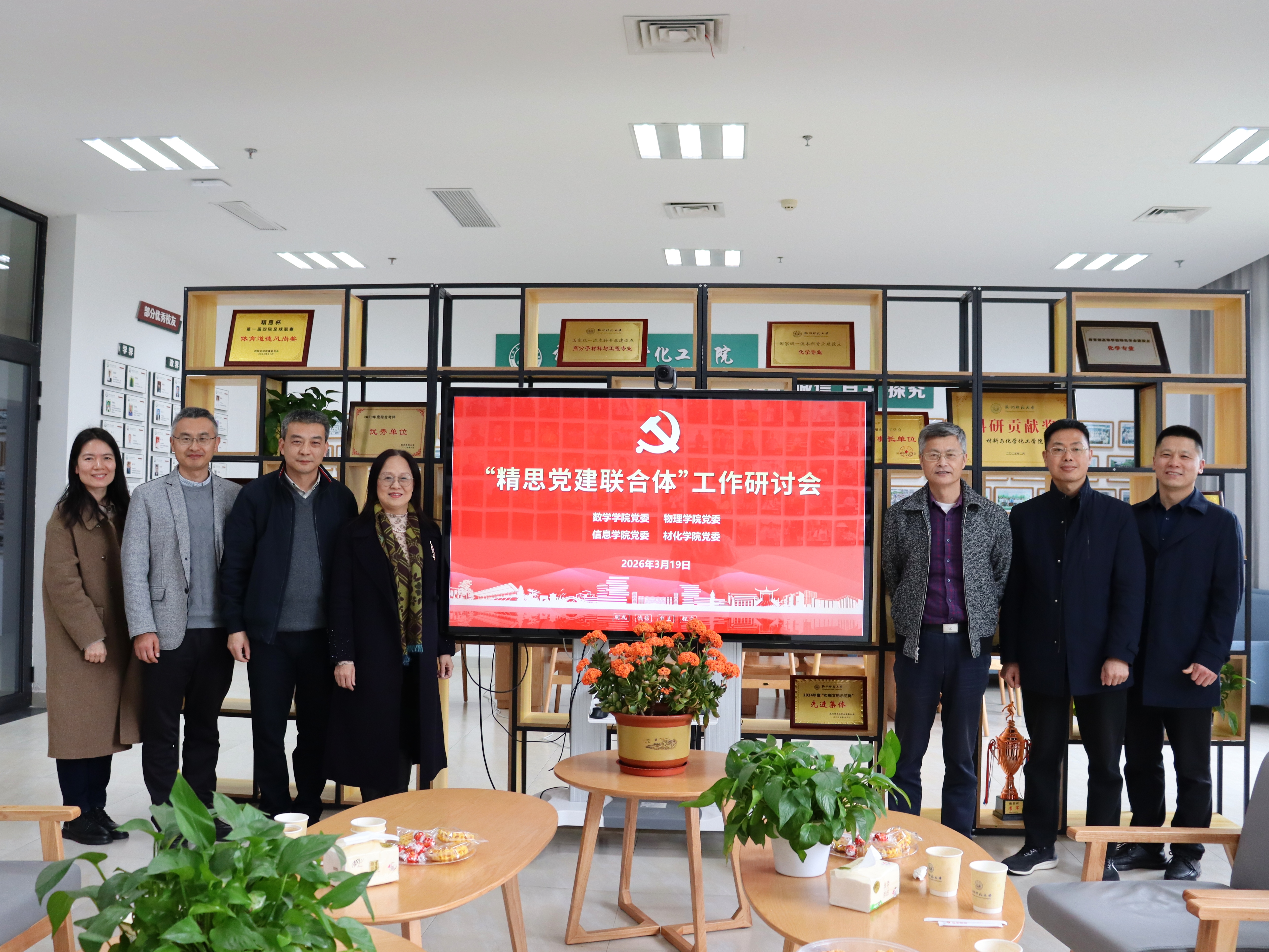 为深入推进党建引领核心作用,凝聚理工学科协同合力,切实推动党建工作与教学科研、人才培养、队伍建设深度融合,3月19日下午,由数学学院党委、物理学院党委、信息学院党委、材化学院党委联合主办的“精思党建联合体”工作研讨会在我院教工之家召开。数学学院党委书记徐金芳,物理学院党委书记何军、副书记苏晓松,信息学院党委书记周春儿、党院办张洋,材化学院党委书记来国灿、副书记管庆江等各学院党委负责人及相关工作人员参加会议。