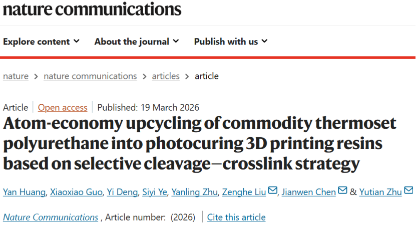 近日,我院朱雨田、刘增贺、陈建闻团队在废旧高分子循环利用领域取得重要进展。相关成果以“Atom-economy upcycling of commodity thermoset polyurethane into photocuring 3D printing resins based on selective cleavage—crosslink strategy”为题发表在《Nature Communications》上。