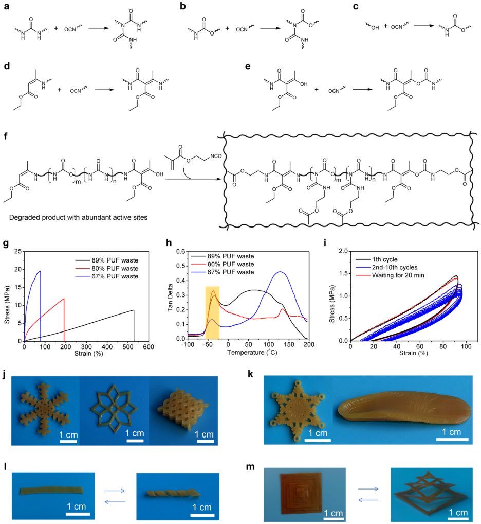 基于解聚产物富含的活性位点,团队采用甲基丙烯酸异氰基乙酯(MAI)进行接枝改性,成功将其转化为光敏树脂。通过调控聚氨酯废料含量(67-89%),可有效调节再生材料的力学性能。含89%废料的配方断裂伸长率超过500%,韧性达19.75 MJ m⁻³,回弹性优异。进一步,团队成功3D打印出雪花、晶格结构和鞋垫等复杂形状产品。此外,由于主链保留的氨酯/脲键可在热刺激下发生动态交换反应,再生材料还表现出形状可编程性。