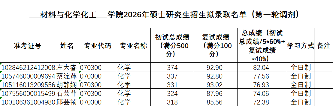 材化学院2026年硕士研究生招生拟录取名单-化学专业(第一轮调剂)