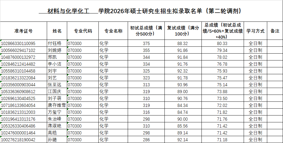 材化学院2026年硕士研究生招生拟录取名单-化学专业(第二轮调剂)